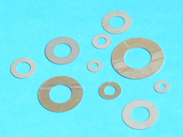 A mixture of 0.010 and 0.015 thick shim washers with bore sizes from 3/16 to 3/4 . Ideal for shimming dynamos, distributors etc.