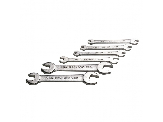 Six spanners in 12 BA sizes: 0-2/1-3/4-6/5-7/8-10/9-11. Supplied in tool roll and manufactured from Chrome Vanadium.