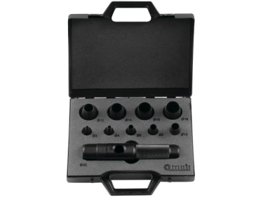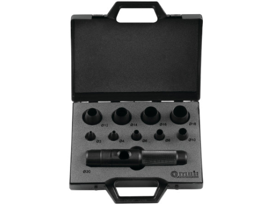Holes can be neatly punched with the 11 piece Wad Punch Set which contains 10 wad punch sizes from 3 to 20 mm diameter.