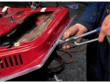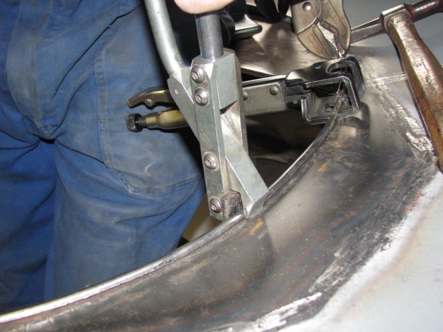 Monteer een nieuw deurpaneel op het binnenframe zonder de buitenzijde te beschadigen. Plaats de deurplaat op het frame. Buig de felsrand geleidelijk om. Draai de tang zodat het kunststof blok tegen de buitenzijde van de deurplaat ligt en knijp nu het laatste stuk van de flens strak over het frame.
