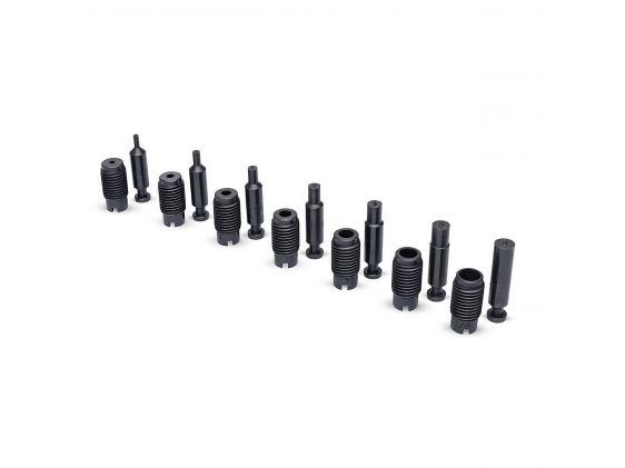Set wordt geleverd met 7 pons- en die sets in de volgende inch maten: 3/32''. 1/8''. 5/32''. 3/16''. 7/32''. 1/4'' en 9/32''